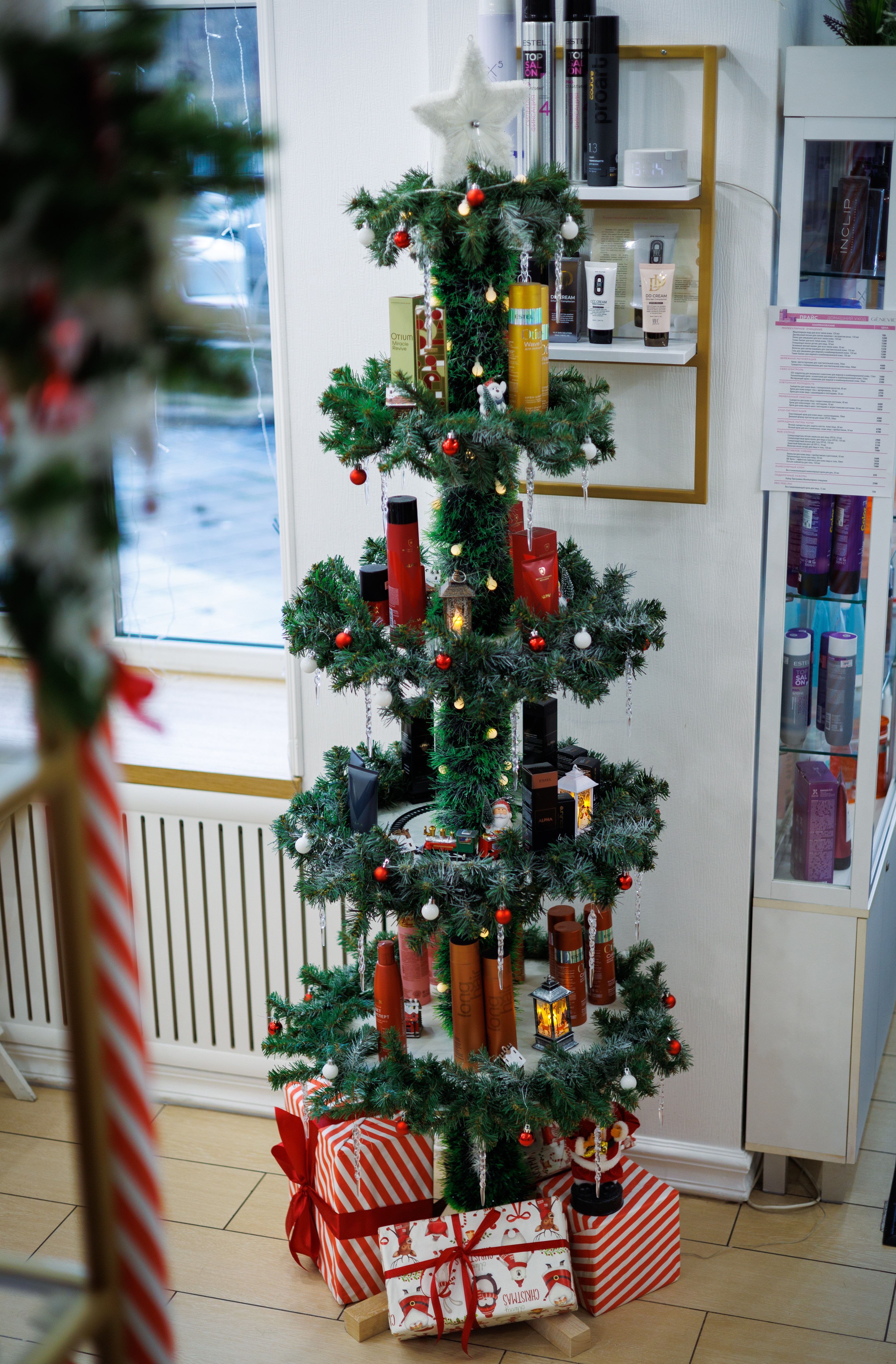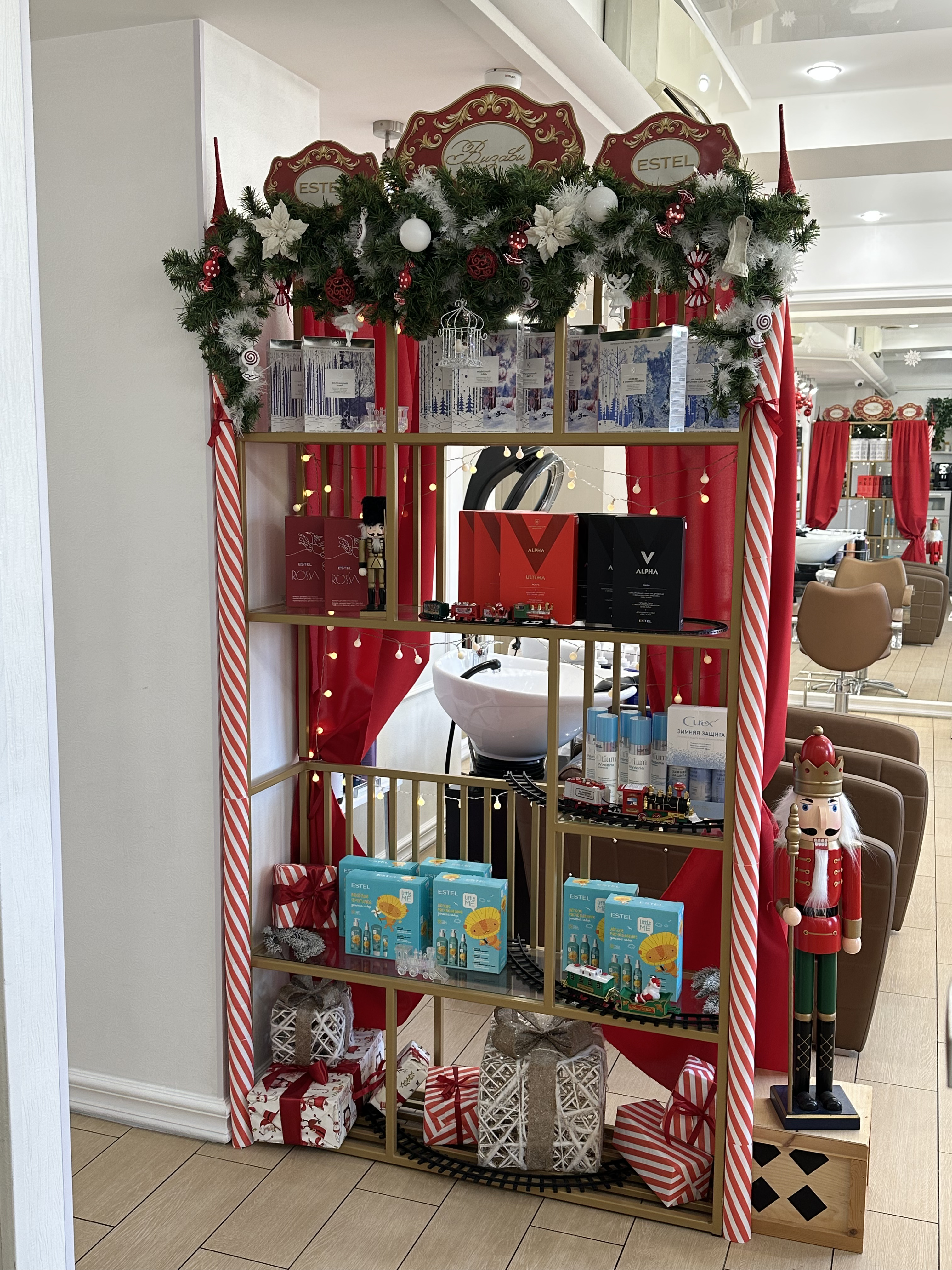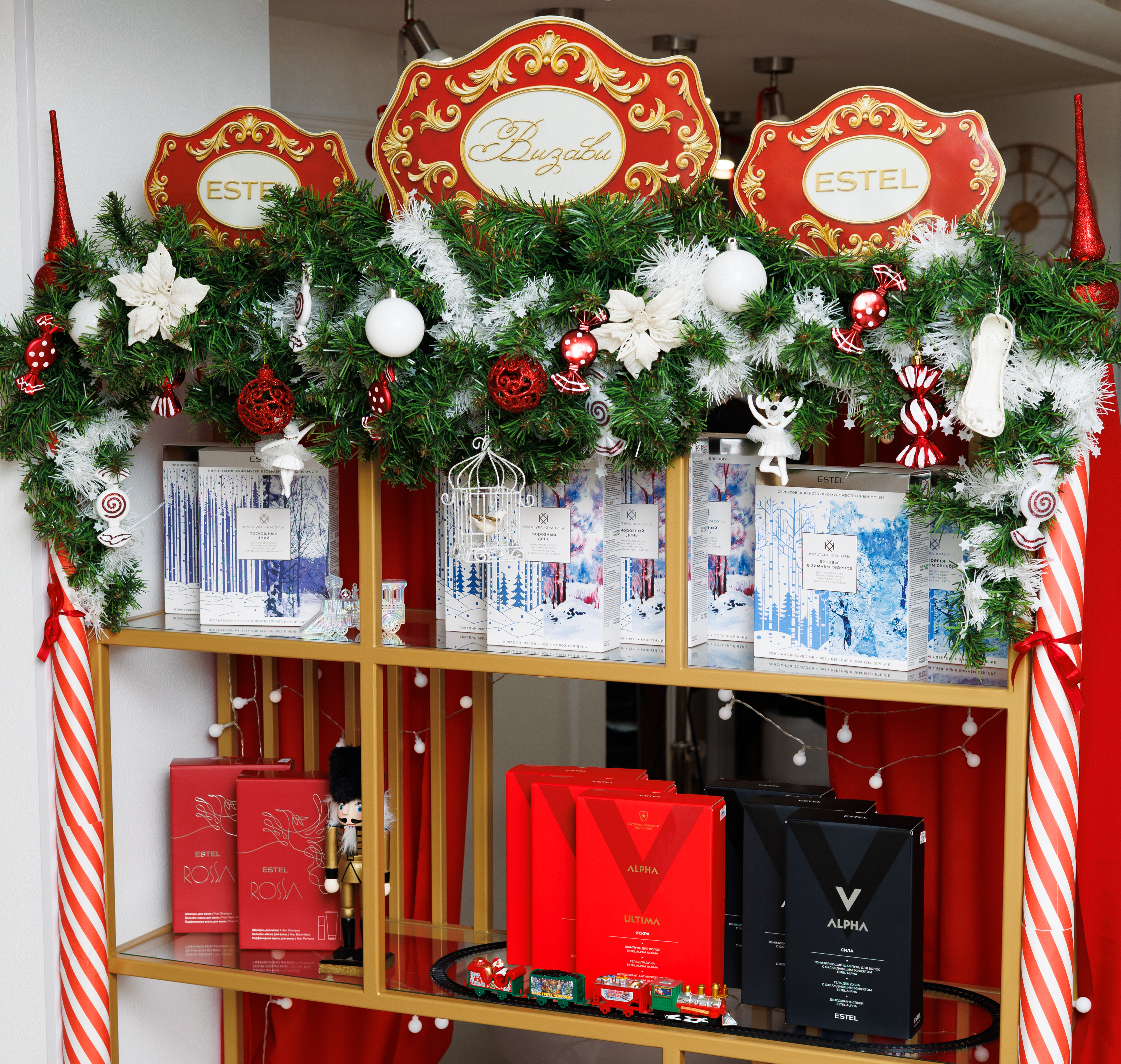 Концепция новогоднего декора Визави основана на идее эмоционального мостика между детством и взрослой жизнью, а готовые наборы Estel интегрированы в оформление, поддерживая главную идею: «Мы уже обо всем позаботились». Клиенту не нужно суетиться, он здесь — главный зритель, для которого творится волшебство красоты.