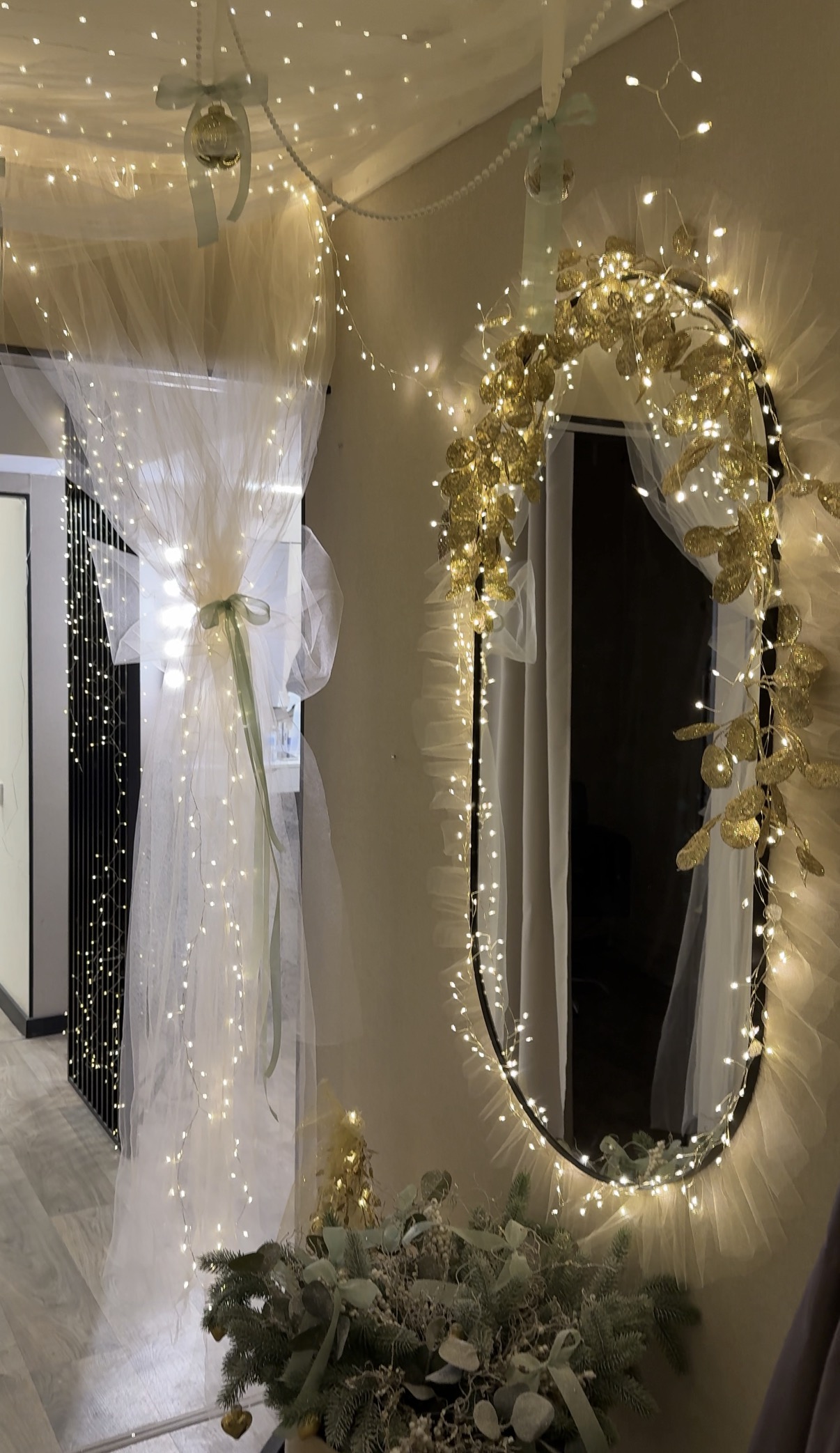 Пространство украшено нежными огоньками, которые создают тёплую, расслабляющую атмосферу, напоминая о уютных вечерах и уютной домашней обстановке. Мягкое мерцание огоньков подчеркивает элегантность интерьера, делая каждый визит особенным событием.